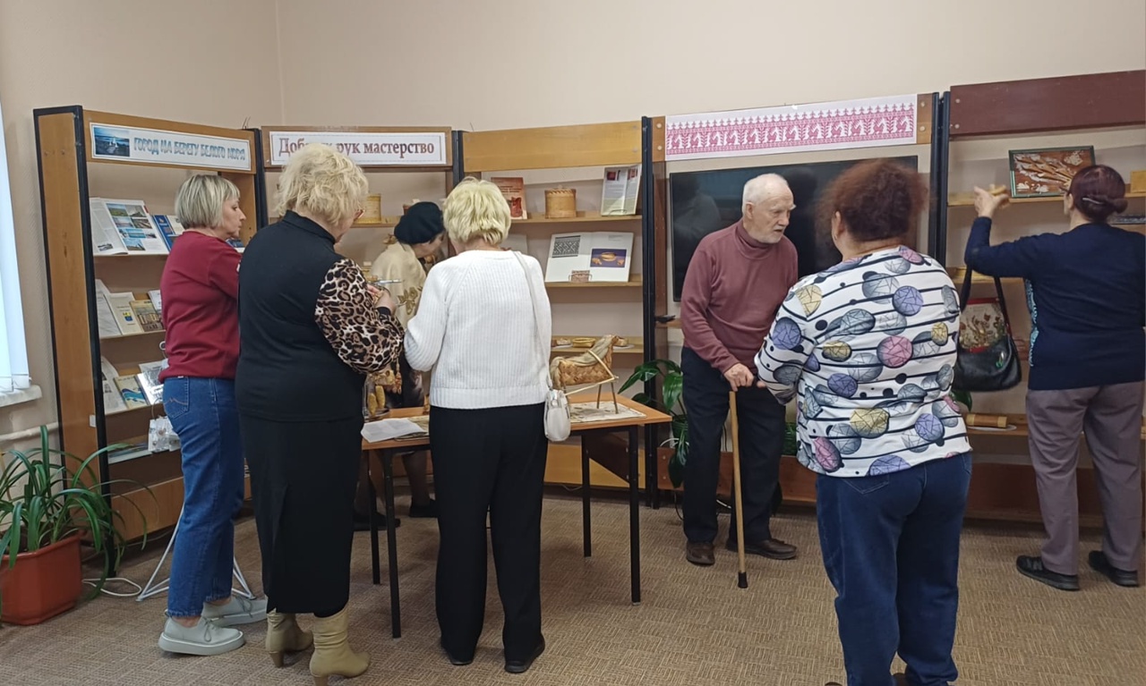 К встрече была подготовлена выставка «Добрых рук мастерство». Галина Дмитриевна познакомила с предметами крестьянского труда и быта, представленными на выставке, к которым относятся туеса, лапти, погремушки, солонки, предметы для рыбной ловли, обереги и другие интересные вещи.