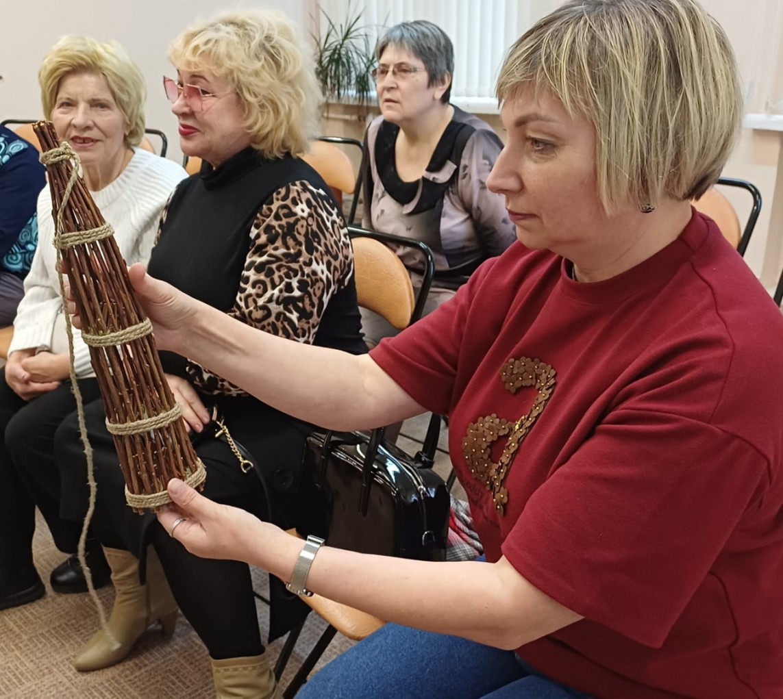 Галина Дмитриевна рассказала о том, что береста привлекла её внимание ещё в детстве. А позже берестоплетение стало её активным увлечением. Ведущая и аудитория задавали вопросы о том, как проходит процесс сбора берёзовой коры, её подготовки к созданию шедевра, сколько времени уходит на создание вещи.