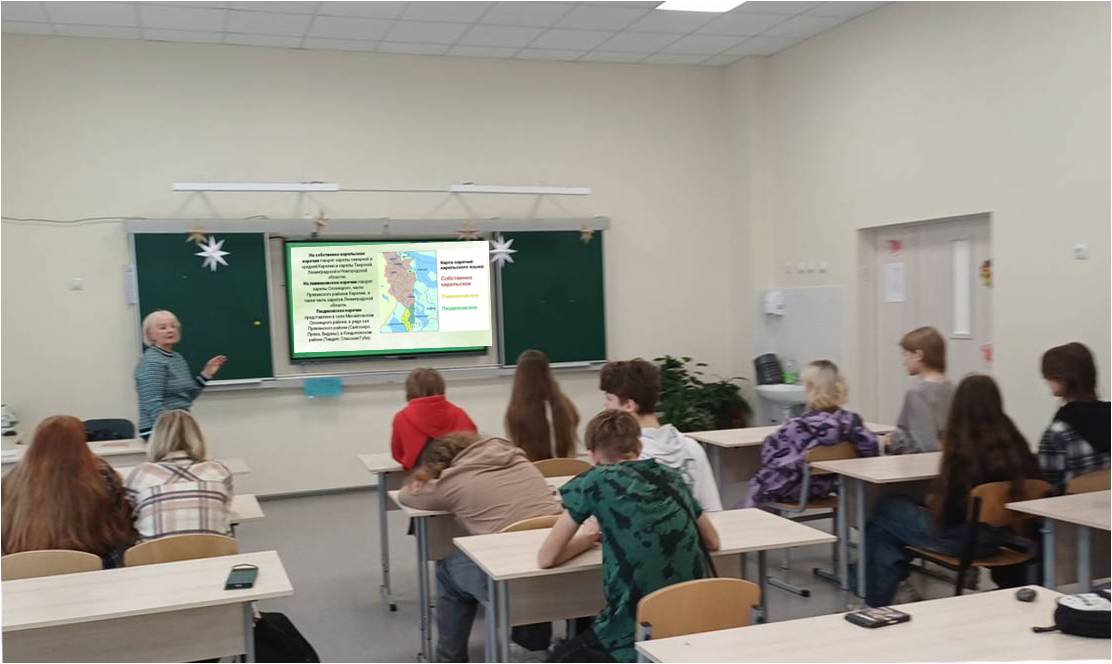 Школьники попробовали свои силы в разгадывании довольно трудных карельских загадок, дополняли пословицы и поговорки подходящими по смыслу словами. Чтобы услышать, как звучит карельский язык, посмотрели видеоклипы с популярными песнями на карельском языке.